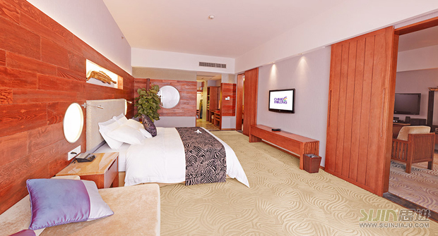 廣州長隆酒店客房家具白虎房樣式:紋理清晰唯美的原木墻壁,行走在與之相呼應的紋路毛毯,觸摸那繡上雪虎花紋的被褥,你是否也有一種走進了高貴雪虎所生長的森林似的錯覺?