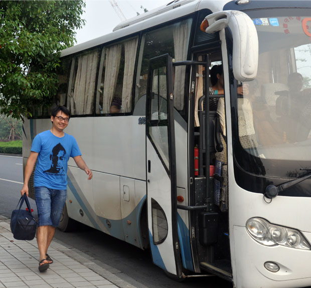(圖為出發(fā)前,員工滿面笑容的上車)